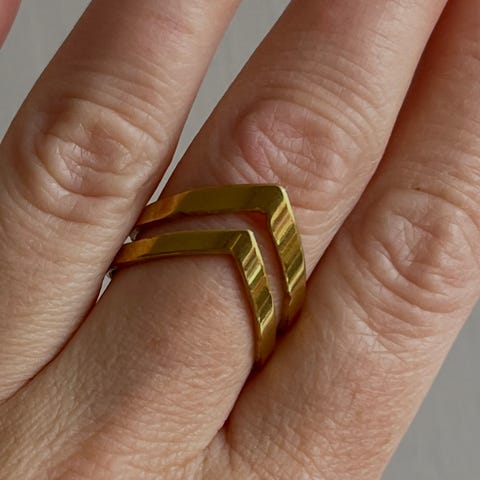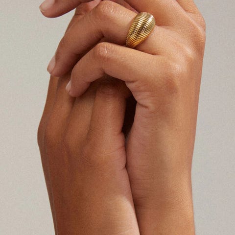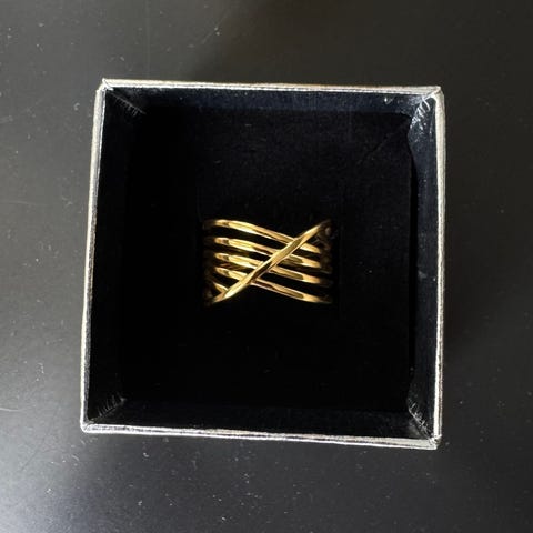 Forgyldt ring fra Pilgrim til kvinde med bred, rillet front og justerbar åbning bagpå. Sidder på originalt kort, hvor der står at den er lavet med min. 75% genanvendt materiale.