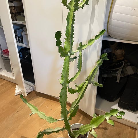 Stor grøn stueplante i høj, sølvfarvet potte. Giver godt med grønt til stuen og står fint ved et vindue.