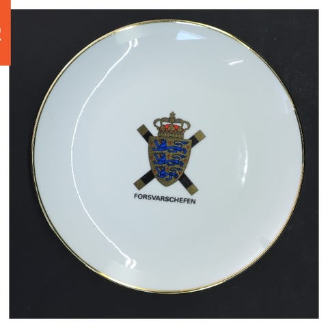Produktet er en rund tallerken med et klassisk design. Den har en glat, lys overflade med præget tekst og detaljer i guld. Materialet er porcelæn. Tallerkenen viser inskriptioner og et symbol, der relaterer til Margrethe II.