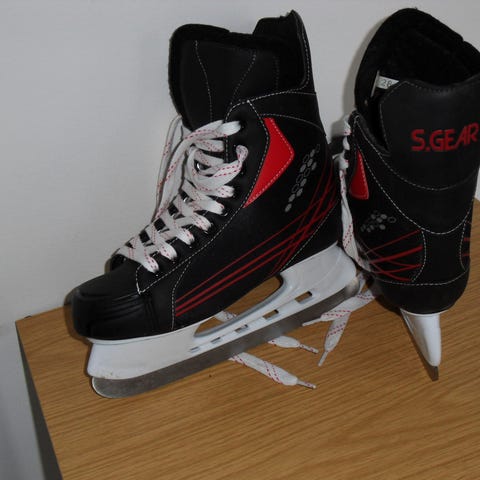Alpine ishockey skøjter i str 38 med snørelukning. Sort/grå model med polstret skaft og hård hælkappe. Der er lidt rust på klingen som det fremgår af billeder, men ellers velholdte. (Er st. 38, selvom der på æsken står 41)