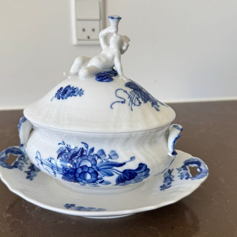 Stellet er Royal Copenhagen Liselund, og det er en Mørkeblå Terrin med låg Nr. 174 og skål nr. 173