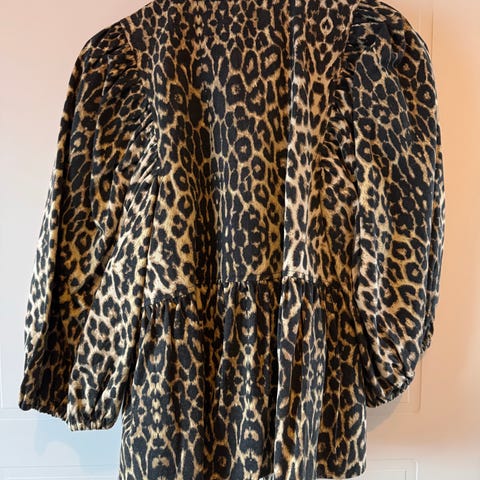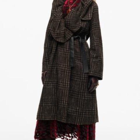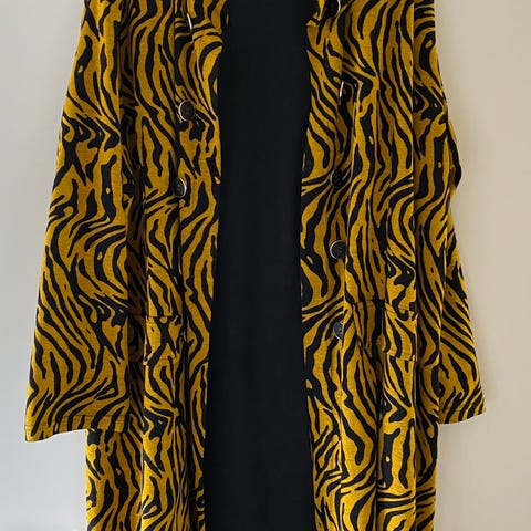 Multifarvet frakke i str M i polyester med tigeragtigt mønster. Har bælte i taljen, knaplukning foran og lommer i siderne.