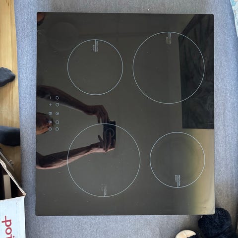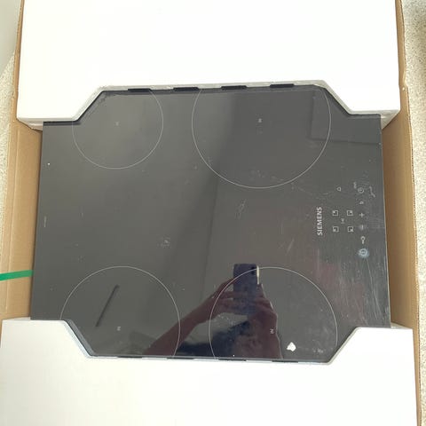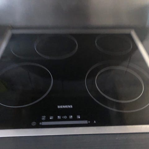 Siemens ET611HE17E keramisk kogeplade med fire kogezoner og sort glasplade. Har touchbetjening på fronten og flad overflade, der er nem at tørre af. Mangler strømforsyning