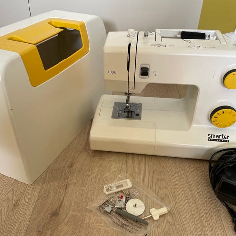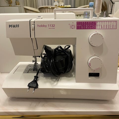 Pfaff Hobby 1142 symaskine i hvid med flere indbyggede stingprogrammer. Har drejeknapper til indstilling foran og bærehåndtag på toppen, nem at have stående fremme.