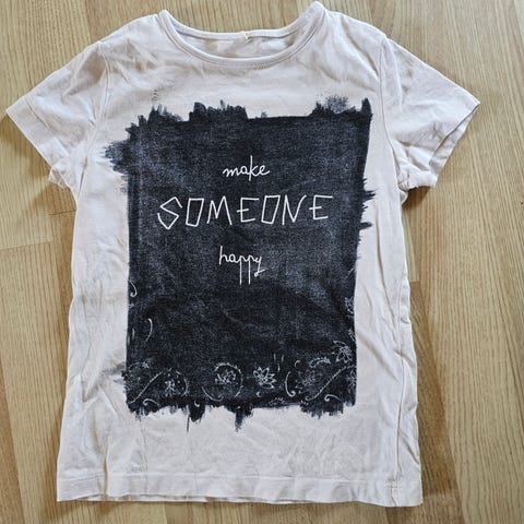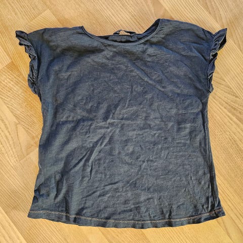 Hvid T-shirt fra Mango Kids i bomuld, pige str 116. Kortærmet model med små flæser ved ærmerne og let struktur i stoffet. Sølvtråde i nederste syning for feminin detalje.