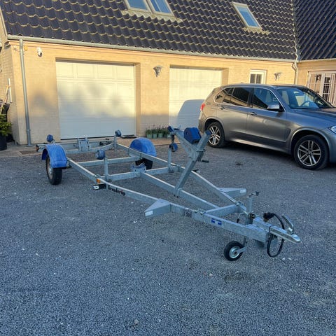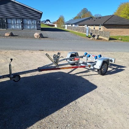Bådtrailer med spil, ruller og blå skærme, klar til at trække båd. Registreringsnummer ED1625.