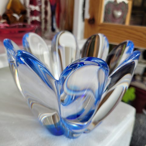 Smuk og dekorativ håndblæst kunstglas skål, lavet i en dyb blå farve med klare gennemsigtige glas kanter, skålen er formet i en flot flammeform. Den er udført i Murano stil og glasset fremstår ekstra flot i lys. Skålen er et flot dekorativt element til indretningen - perfekt i vindueskarmen, på sofabordet eller andre steder hvor den kan bruges som slikskål, opbevaring diverse ting eller man kan stille et lille lys i og tænde om aftenen for ekstra hygge.