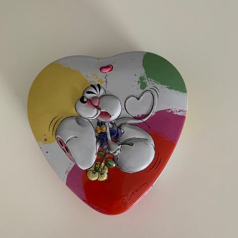 Denne arkivgenstand er et sjældent og hjertevarmt fragment af 70'ernes populærkultur: et hjerteformet viskelæder med Kim Casalis ikoniske "Love is..." (Liebe ist...) illustration. Motivet forestiller de to karakteristiske figurer i en omsorgsfuld scene med teksten: "Liebe ist.. wenn SIE für ihn die schönste Krankenschwester ist" (Kærlighed er.. når HUN er den smukkeste sygeplejerske for ham). Produceret af det anerkendte tyske mærke Läufer Plast, repræsenterer dette objekt en tid, hvor hverdagsartikler blev bærere af universelle budskaber, og det står i dag som et eftertragtet samlerobjekt inden for retro-stationery.