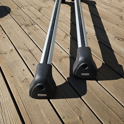 Originale tagbøjler til Škoda Fabia med tagrælinger, i sølvfarvet aluminium med sorte fødder. Har lås i fødderne og måler ca. 118 x 111 cm, max belastning 75 kg