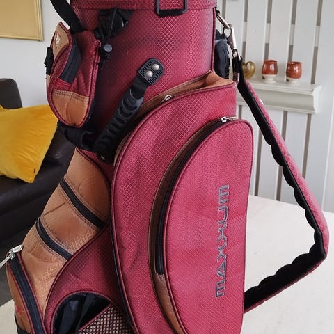 Golfbag med flere forskellige jern, hybrider og køller fra bl.a. Ping, RAM, Wilson og Wizard. Tasken har flere lommer og ruminddeling i toppen, så køllerne står adskilt og er nemme at få fat i.