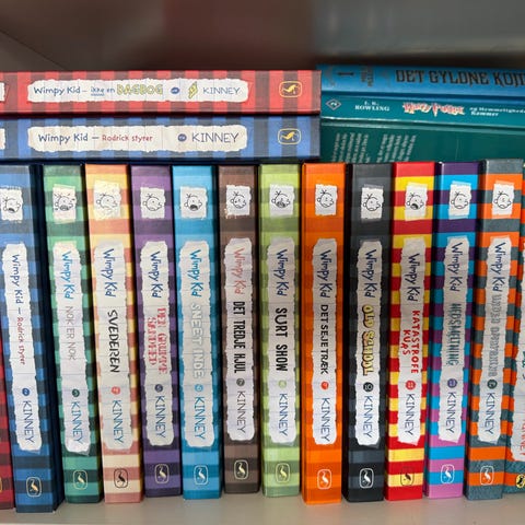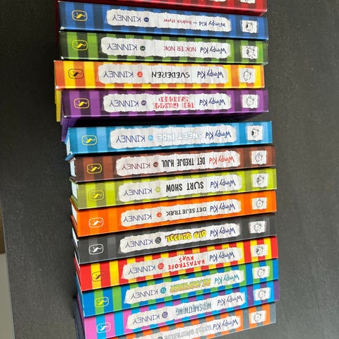 Samling med 6 Wimpy Kid bøger af Kinney sælges samlet. Forskellige farver rygge, alle i hardback og på dansk.