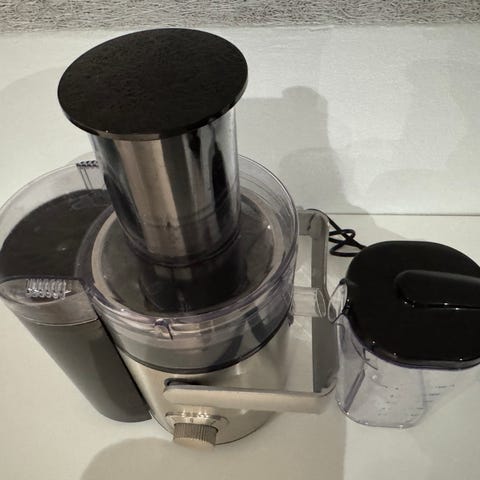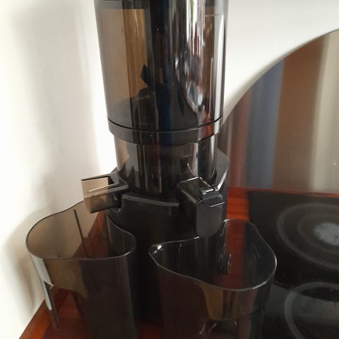 Cook & Baker saftpresser med langsom juicer-funktion. Har gennemsigtig beholder, sort top med påfyldningsrør og aftagelige plastbeholdere til saft og frugtkød.