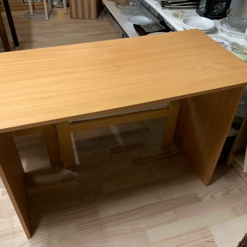 Hvidt lille skrivebord med åben hylde under bordpladen til mapper og papir. God som lille arbejdsplads eller til computer i et hjørne af rummet.