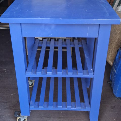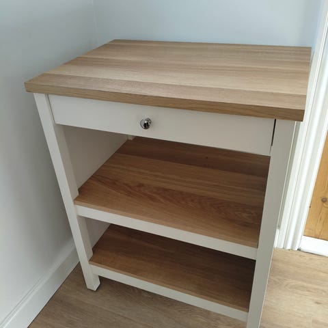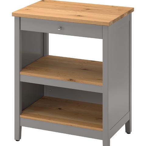 IKEA bord med træbordplade, hvidt stel, en skuffe og to åbne hylder. God som lille køkkenø eller opbevaringsbord til fx maskiner og køkkengrej.