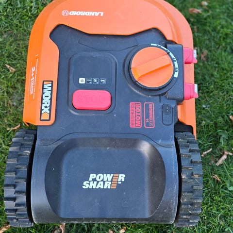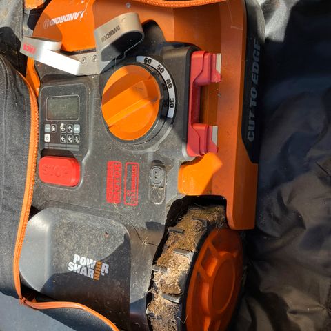 Worx robotplæneklipper i sort og orange, nem at styre via panelet på toppen. Med medfølgende base, der lægges på græsset, og store hjul der tager godt fat i plænen. Virker fint men har fået ny da jeg er træt af at lappe kanttråd