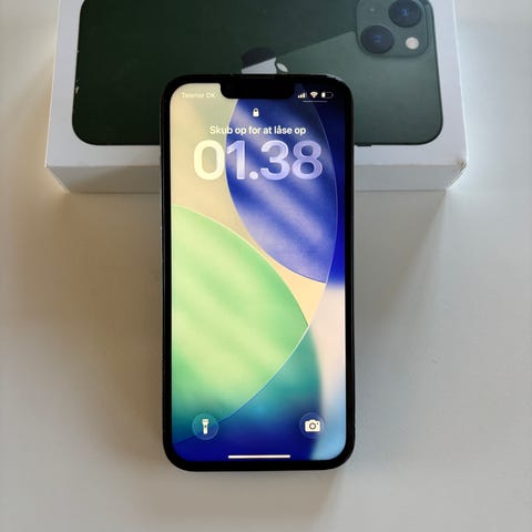 Apple iPhone 13 Pro Max med 256 GB lagerplads i grøn farve. Leveres i original æske med metalramme og tre kameraer på bagsiden.