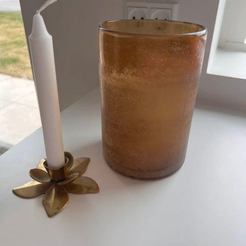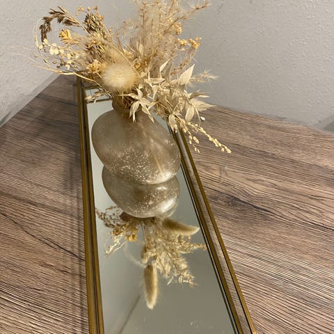 dekorationsbakke med spejl og metalramme i messinglook. Fin til lysestage, vase og andre småting på bord eller kommode.
