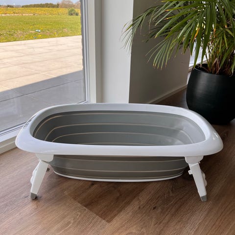 BabyDan badekar på stativ i hvid og grå, så du kan bade baby i en god arbejdshøjde. Stativet kan klappes sammen, og badekarret har glat inderside, der er nem at skylle af. Karret kan rumme 100 l