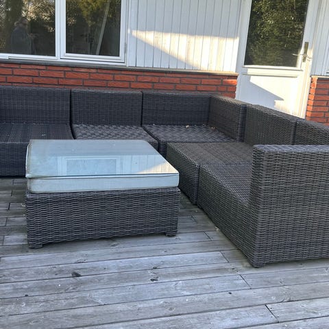 Loungsæt sort m/grå hynder, incl. stol og højdejusterbart bord, solvogn sort m/grå hynde, stor hyndeboks sort, vandræt og