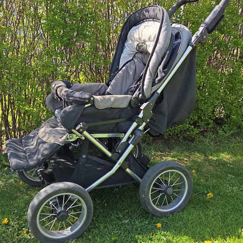 BRIO barnevogn i sort med stort stel, solide aftagelige hjul.