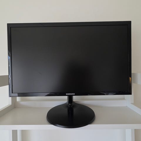 Samsung 22" computerskærm i sort med enkel fod. Har knapper under skærmen og tilslutning bagpå til bl.a. DVI og strøm.