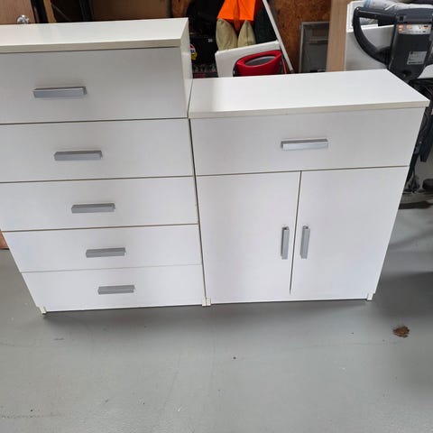 Hvid kommode med fire skuffer og mørke metalgreb. God som opbevaring i stue, soveværelse eller entré.