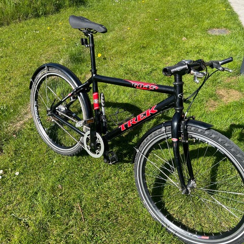 mountainbike i str M med 26" hjul, i rød og hvid. Har affjedret forgaffel, gear og fælgbremser for og bag samt brede dæk til terræn.