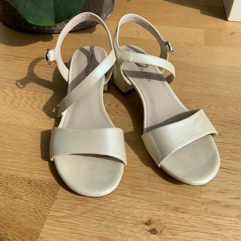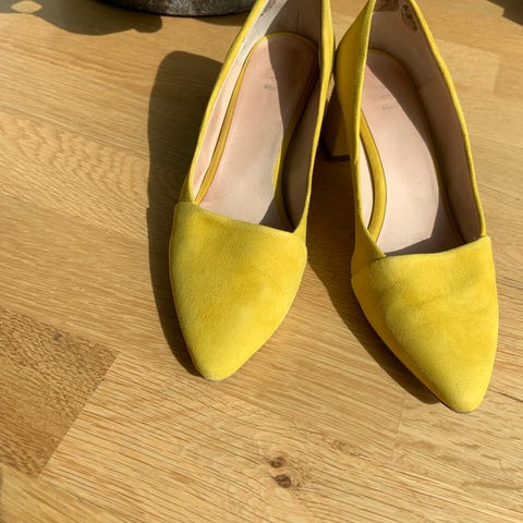 Røde Angulus laksko i str 38,5 med lav blokhæl og stor sløjfe foran. Indersålen er lys og skoene har lukket hæl og rund udskæring ved anklen.