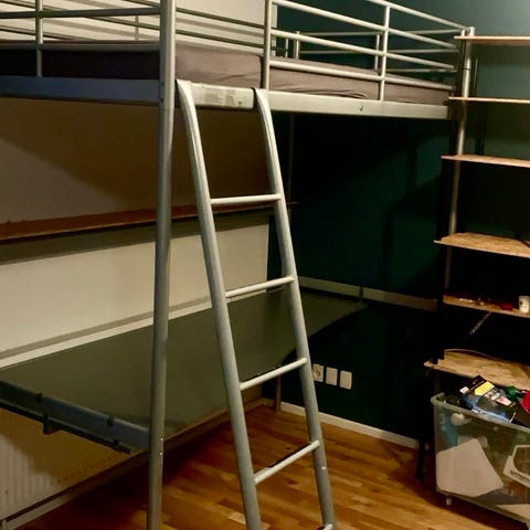 IKEA højseng i grå metal med seng øverst og stort skrivebord under. Der er stige foran og sider med gitre hele vejen rundt på sengen.