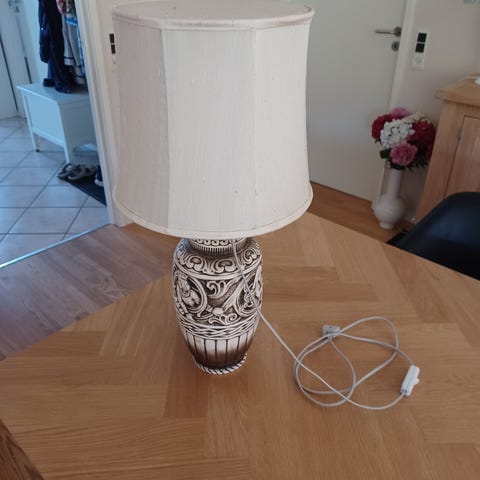 Flotte bordlamper fra IKEA designet af Aage Petersen i grå keramik. Har klassiske hvide plisserede lampeskærme og almindelig ledning med afbryder.