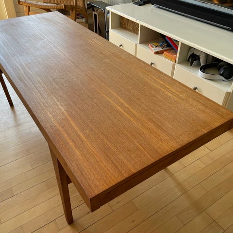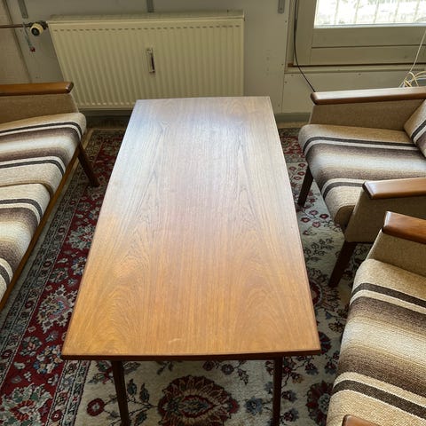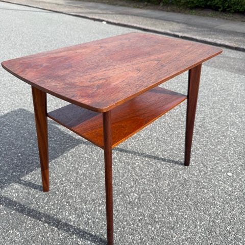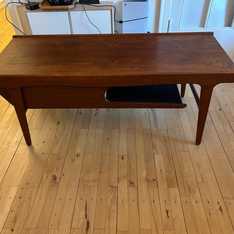 Flot vintage sofabord i teak med udtræksplader fra 60’erne. Elegant skandinavisk design med praktisk hylde under bordet. Bordet fremstår i meget flot stand med almindelige få brugsspor.