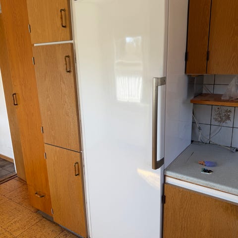 Stor rummelig fryser med tre skuffer og isterningbakke.