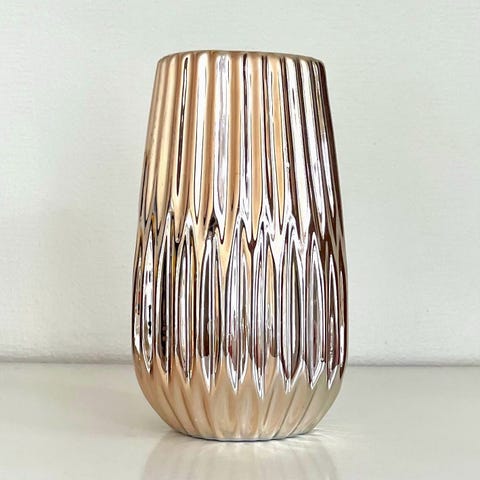 Flot guldfarvet vase med rillet struktur på ydersiden. Indersiden er mørk og den står stabilt på bord eller hylde.