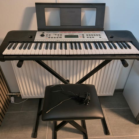 Casio CTK-530 keyboard i sort med fuld klaviatur og mange indbyggede lyde og rytmer. Står på et justerbart X-stativ, og har betjeningsknapper og oversigt trykt på panelet over tangenterne.