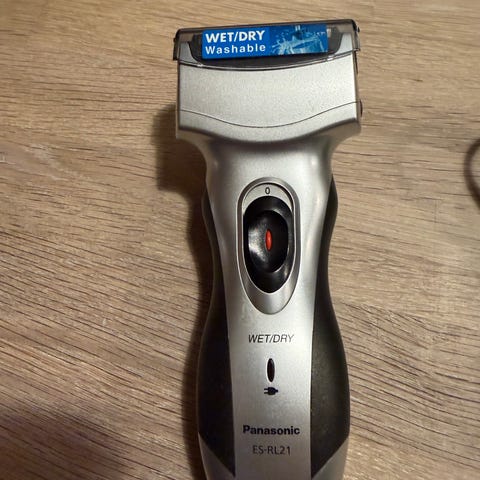 Panasonic ES‑RF41 elektrisk barbermaskine med 4-Blade skærehoved. Har gummigreb på håndtaget og indikatorlys på fronten.