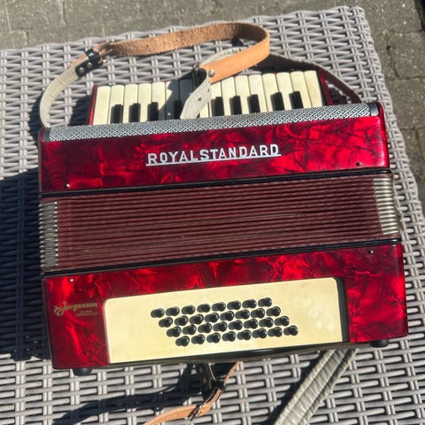 Piermaria harmonika i rød perlemor med klaviatur og mange bas-knapper. Har skulderremme og bærehåndtag samt hård kasse til opbevaring og transport.
