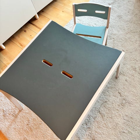 Disse skønne børnemøbler kommer med 3D printede klodser som passer i farveblyant-holderne, så man skifte til en plan flade.