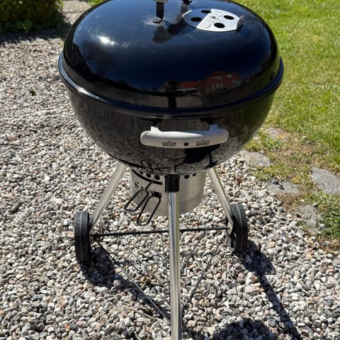 Sort Weber kuglegrill med låg og luftspjæld i toppen. Står på ben med hjul og har askefad under grillen.