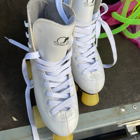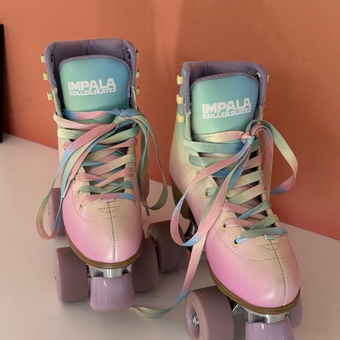 Impala Rollerskates rulleskøjter i størrelse 38. Flotte, klassiske Impala rulleskøjter i hvid med turkise snørebånd. Rulleskøjterne har rosa hjul med en sort yderside. Side-by-side model.