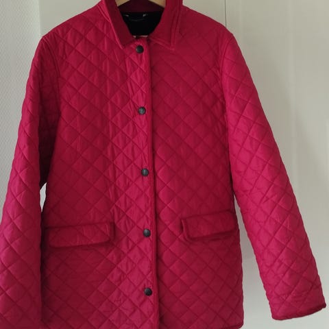 Bordeauxfarvet quiltet Henri Lloyd damejakke med lynlås og 2 sidelommer. Har fleecefoer indvendigt. Str. 5 som svarer til XL. I meget fin stand men har dog nogle ubetydelige mørke pletter ved den ene lomme (se foto). Kan muligvis gå af i vask.
