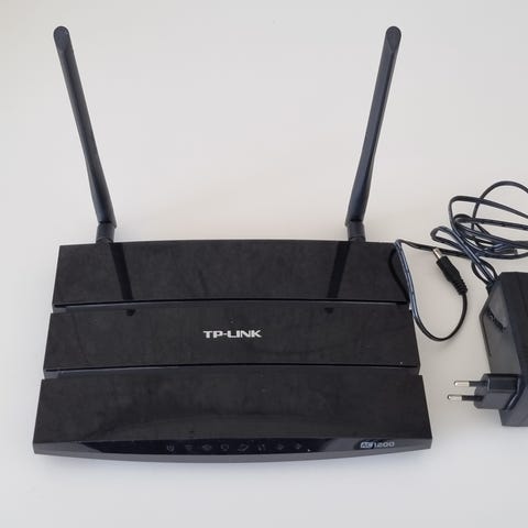 TP-Link Archer C2 AC750 dual band gigabit router med flere LAN-porte bagpå. Har to aftagelige antenner og strømforsyning som på billedet.