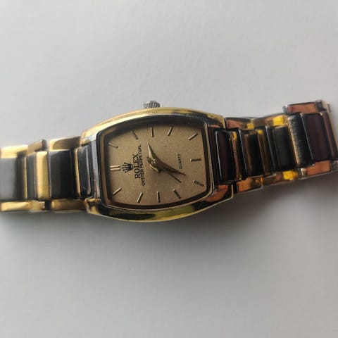 Omega dameur i guldfarvet metal med rund urskive. Klassisk armbånd med led og lukning bagpå.