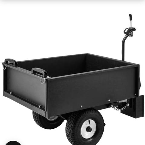 Robust havevogn i metal med gitter-sider og store luftgummihjul. Har trækstang foran og sider der kan åbnes, så den er nem at læsse af og på.