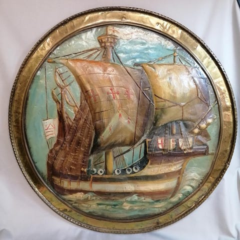 Gammelt dekorativt flaskeskib monteret på træfod. En del af flasken har en “nopret” struktur.