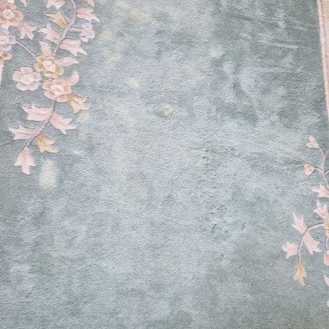 Rugvista uldtæppe i grøn med blomsterkant, måler 160 x 240 cm. Blødt tæppe med vævet bagside, lavet i Indien. Uden pletter.