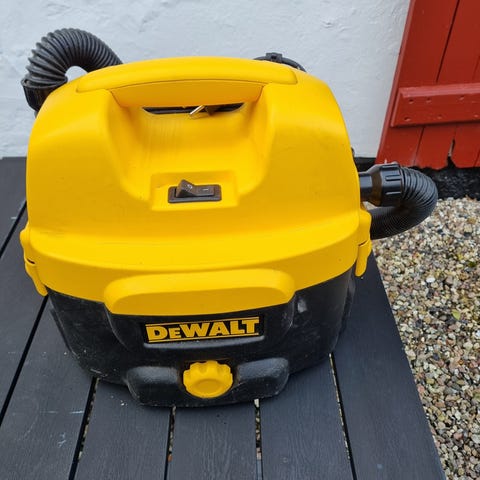 Dewalt gul våd-/tørstøvsuger med bærehåndtag og strømledning, der kan rulles rundt om toppen. Har fleksibel slange foran og tilslutning bagpå til ekstra slange eller udblæsning.