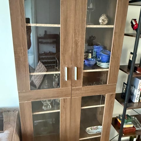 Sælger dette klassiske IKEA DETOLF vitrineskab i glas med træfarvet top.