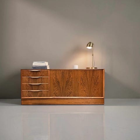 Udført i palisander med fire skuffer og skab.