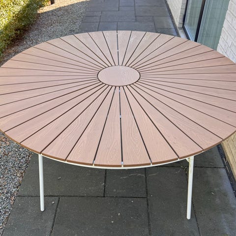 Rundt havebord med 4 stole i metal, gråsort bord er 110 Ø