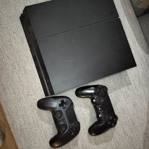 Playstation 4 konsol fra Sony i sort med trådløs controller.